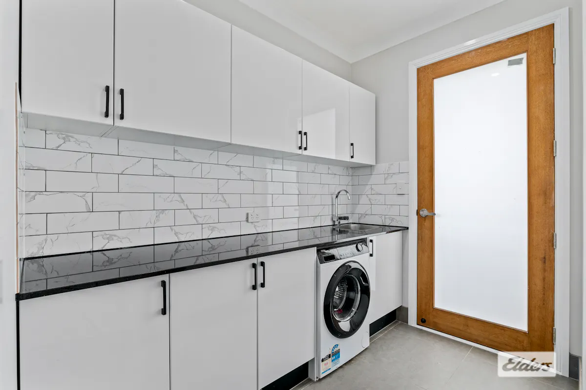 Leading down the hallway you will find a well-appointed laundry. It provides ample storage, having both overhead and bench cupboards, and the same elegant tiling as is in the kitchen and bathrooms. In addition, all of the benchtops in this home are of a striking granite, including the laundry, kitchen and the two bathrooms.